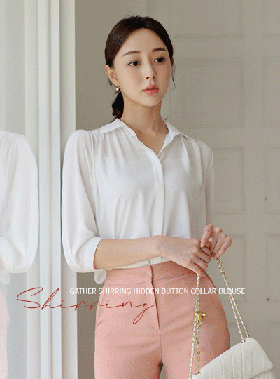 Gather Shirring Hidden Button Collar Blouse(Capri)