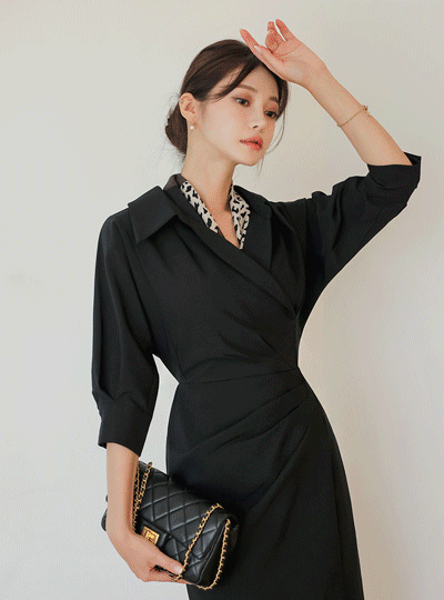 Open Collar Puff Sleeves Unbalance Slit Dress (fall)