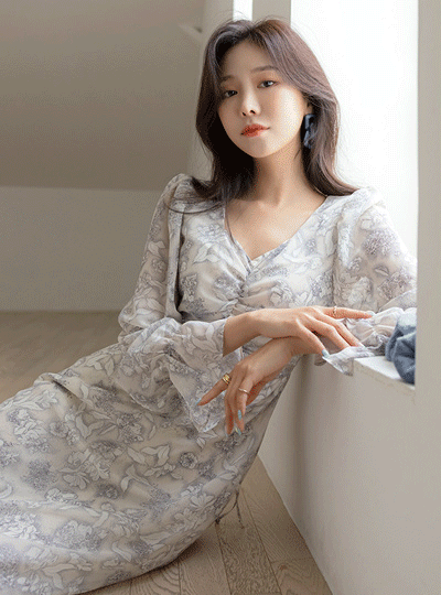Feminine Flower Patterns Sleeves Shirring Chiffon Dress