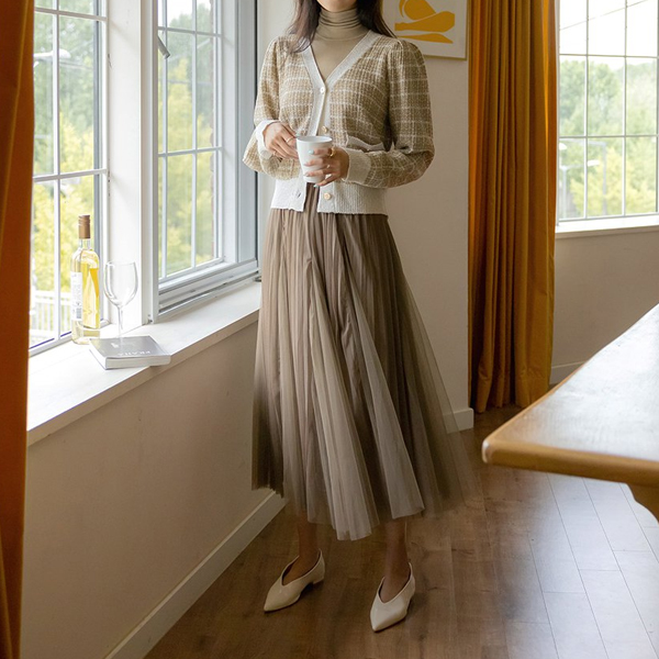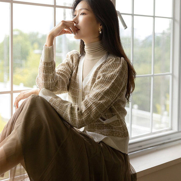 Romantic Puff Sleeves pearl Tweed Knit Cardigan