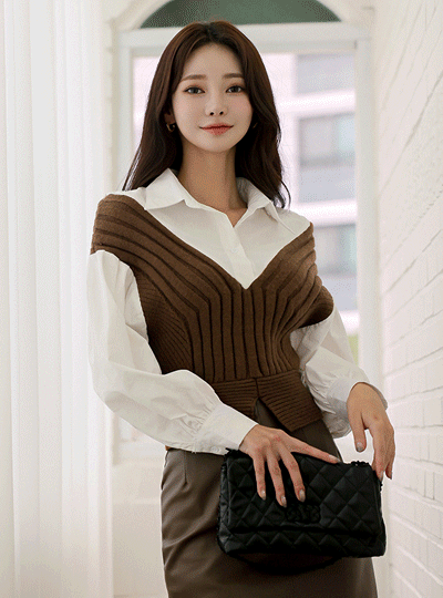 Off Shoulder Knit Vest layered Puff Shirt