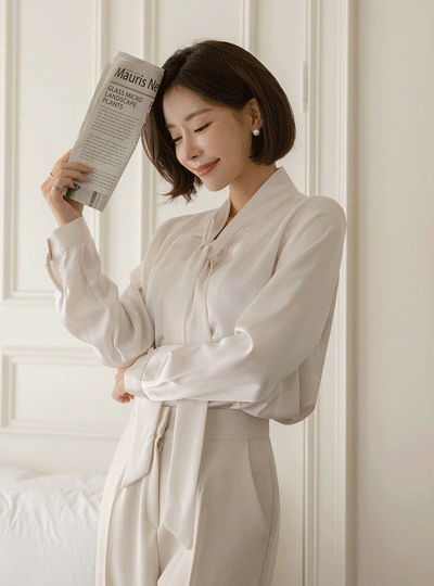 Elegance Glossy Satin Pintuck Tie Blouse