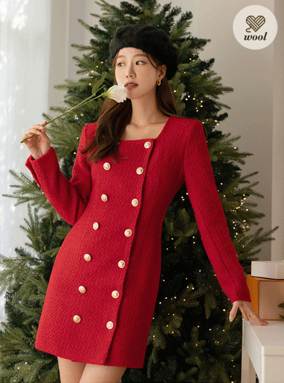 Holiday Gold Button Tweed Wool Dress