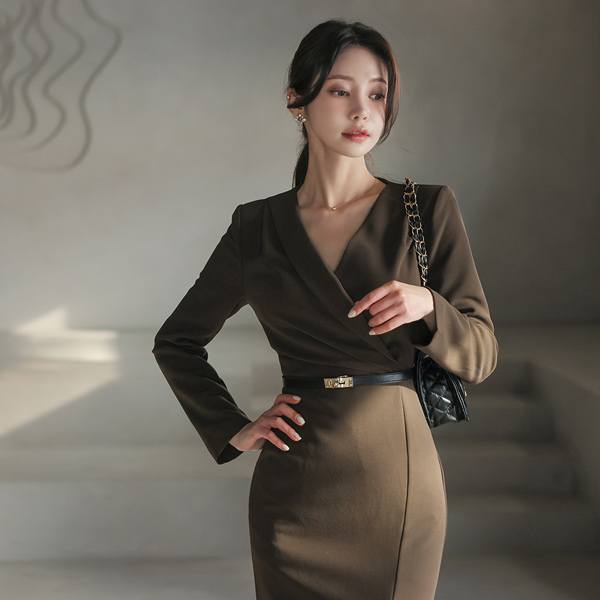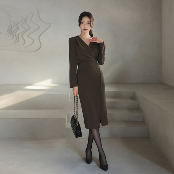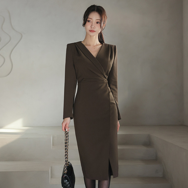 Unbalance Collar Side Pinch Shirring Span Dress
