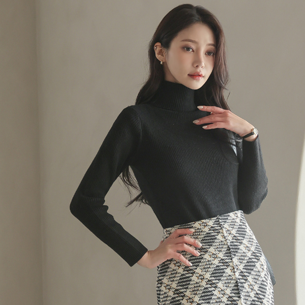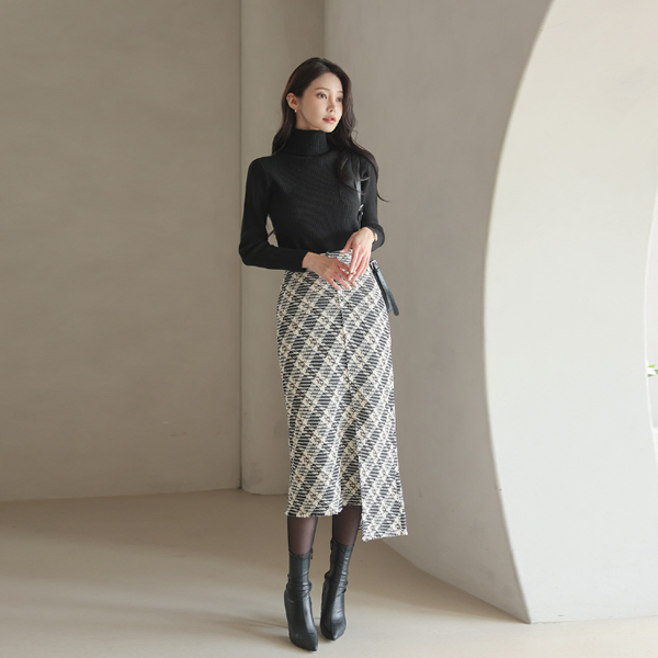 Unbalance Cutting Tweed Check Long Skirt