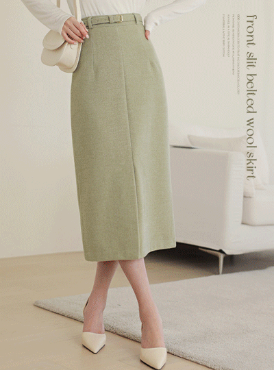 Front Slit Belted Wool Skirt
