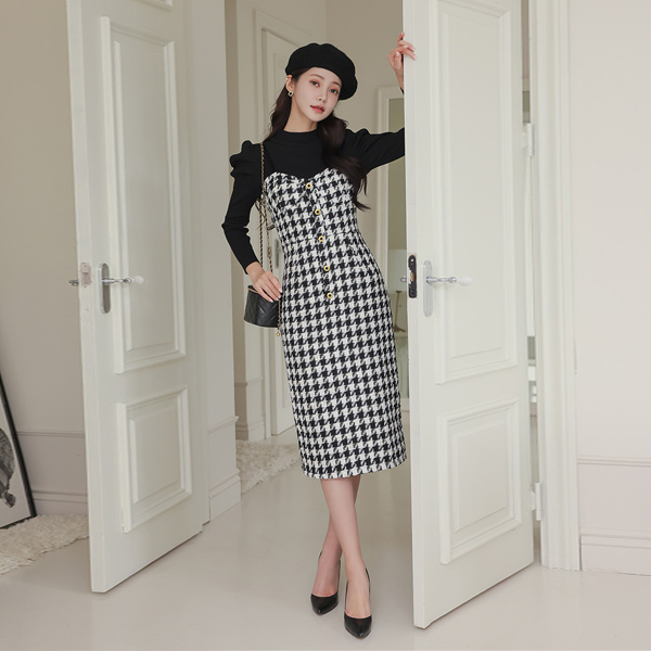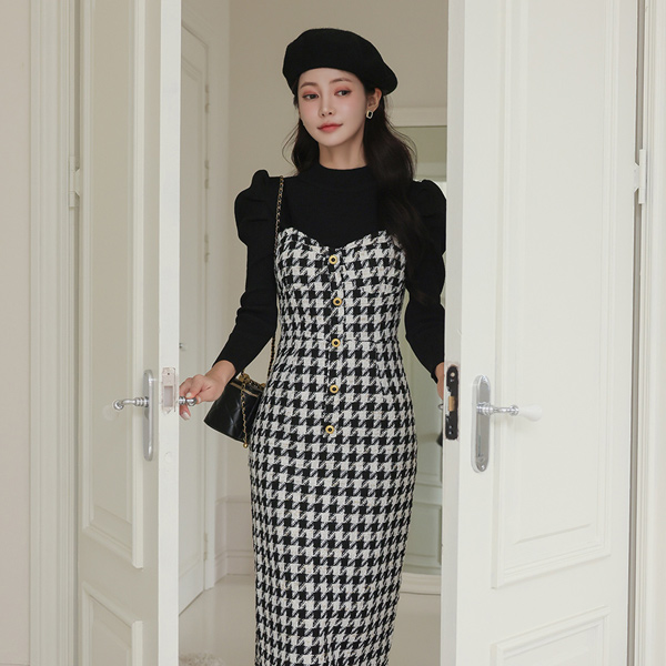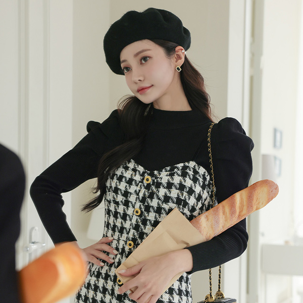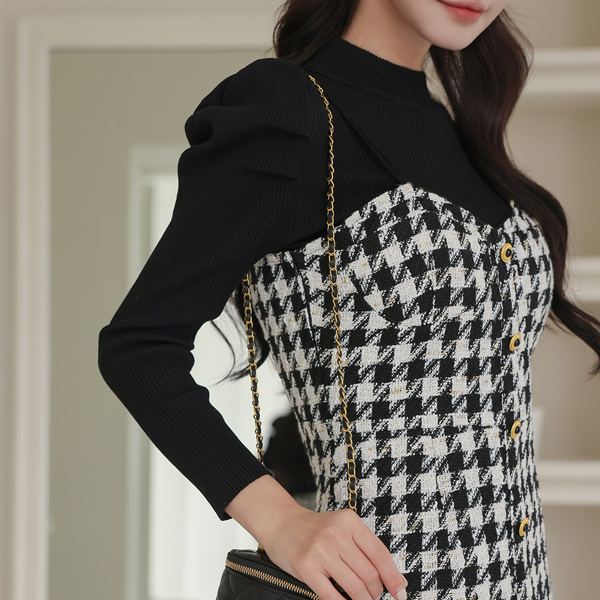 Puff Sleeves Knit&Hound's-Tooth Check Dress SET