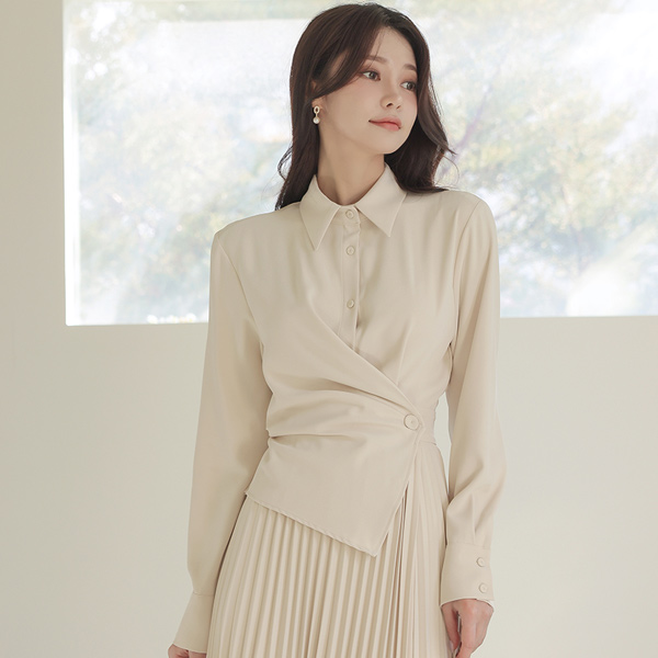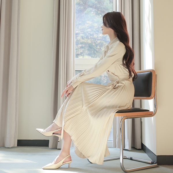 Shirt Unbalance Shirring Wrap Pleats Long Dress