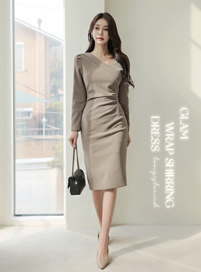 Diagonal ODE Glam Wrap Shirring Span Dress(Long-sleeve)