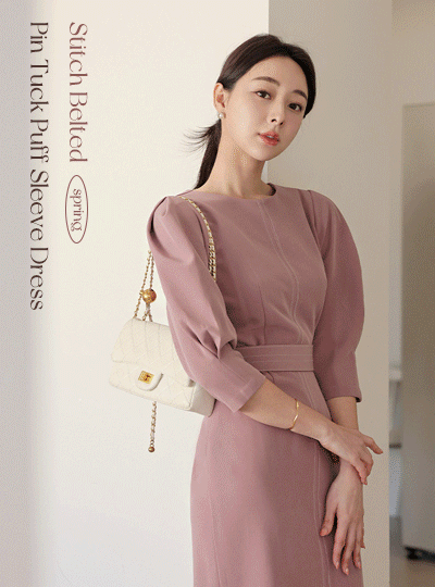 Stitch Belted Pintuck Puff Sleeves Dress(spring)
