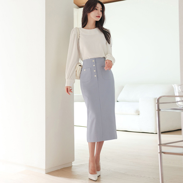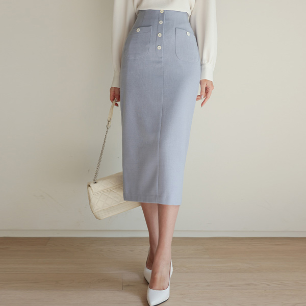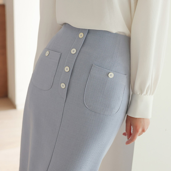 Color Combination Button Double Pocket Front Slit Skirt