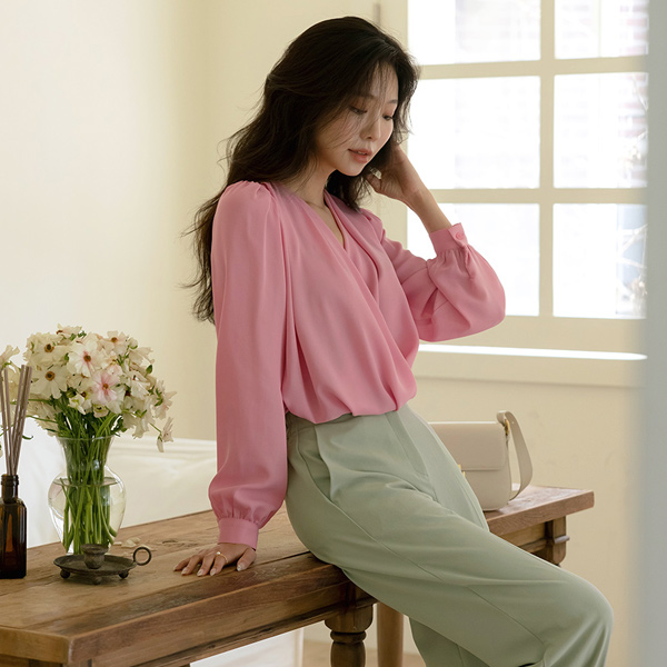 Feminine Mood Wrap Shirring Long-sleeve Blouse