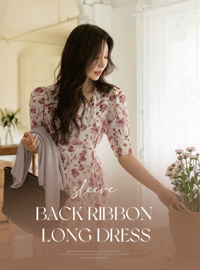 Blossom Volume Sleeves Back Ribbon Long Dress
