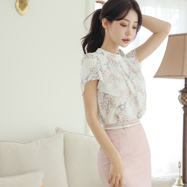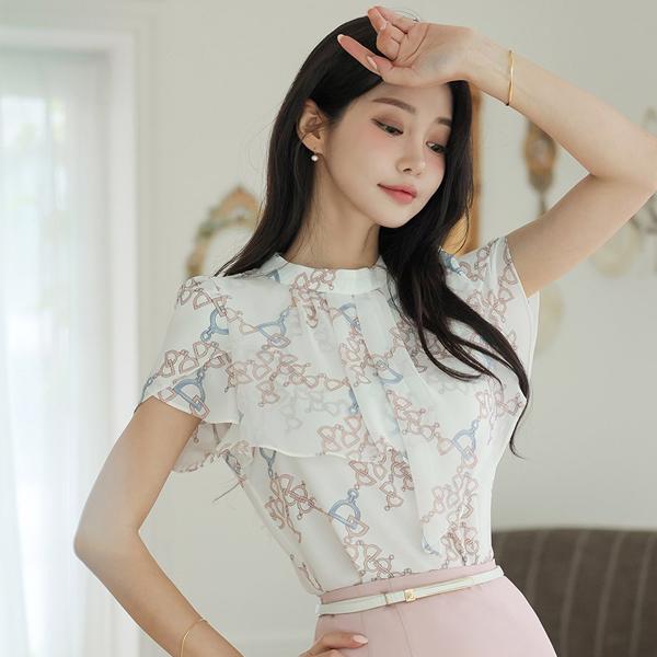 Unbalance Ruffle Edge Tulip-Sleeves Chain Blouse