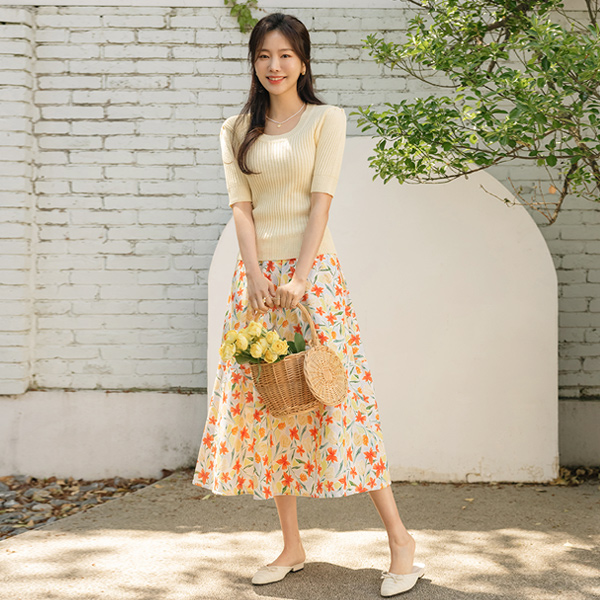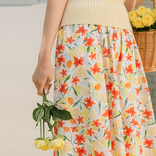 Color Flower Banding A-line Skirt