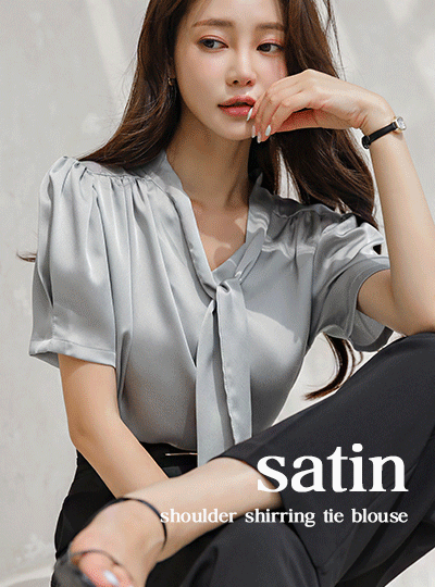 Satin Shoulder Shirring Tie Blouse