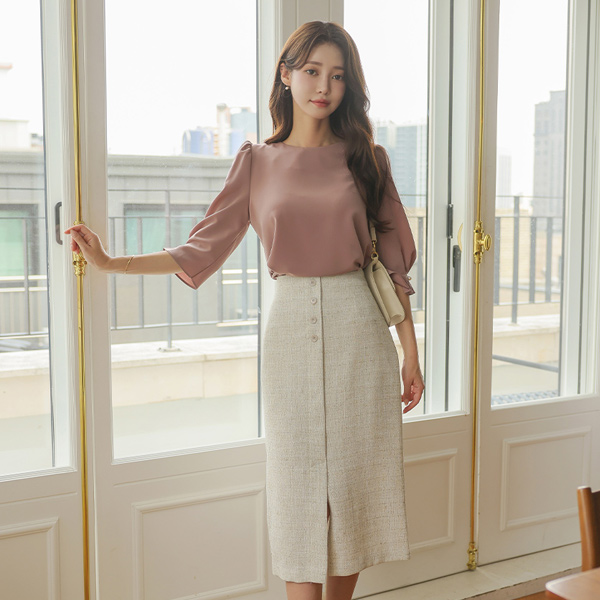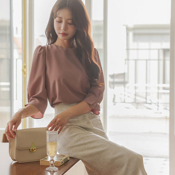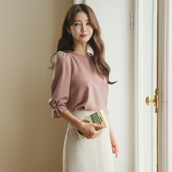 Raund neck Three-Quarter Sleeves Pintuck Pearl Point Blouse