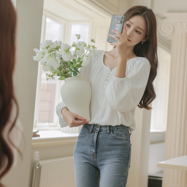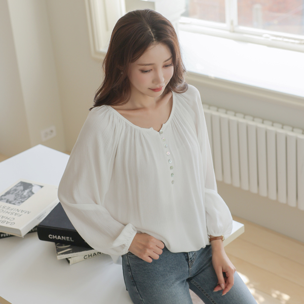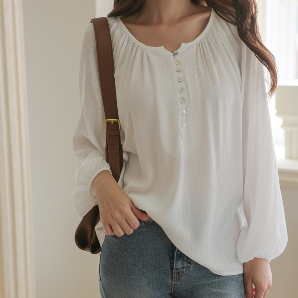 Round Shirring Neck Ragran Shell Button Blouse
