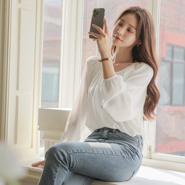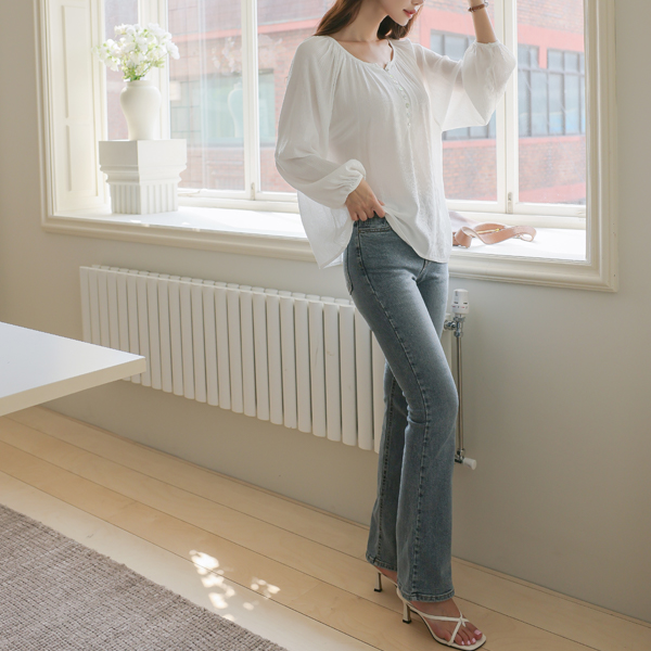 Round Shirring Neck Ragran Shell Button Blouse