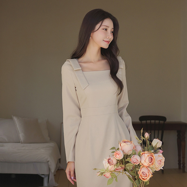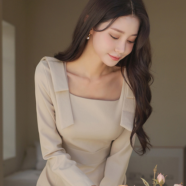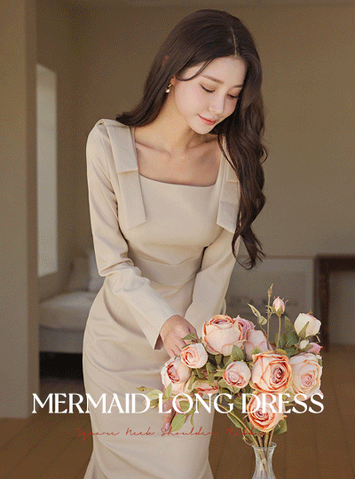 Square Neck Shoulder Ribbon Point Mermaid Long Dress