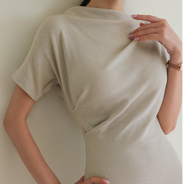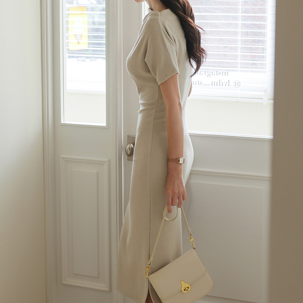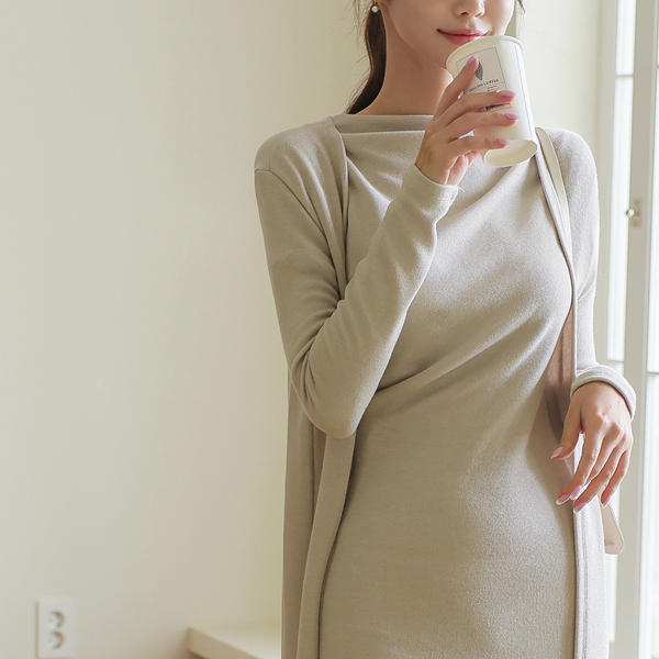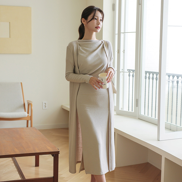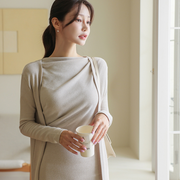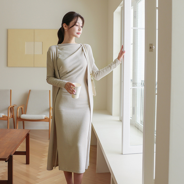 Cap-Sleeves Shoulder Shirring Long Dress&Cardigan SET