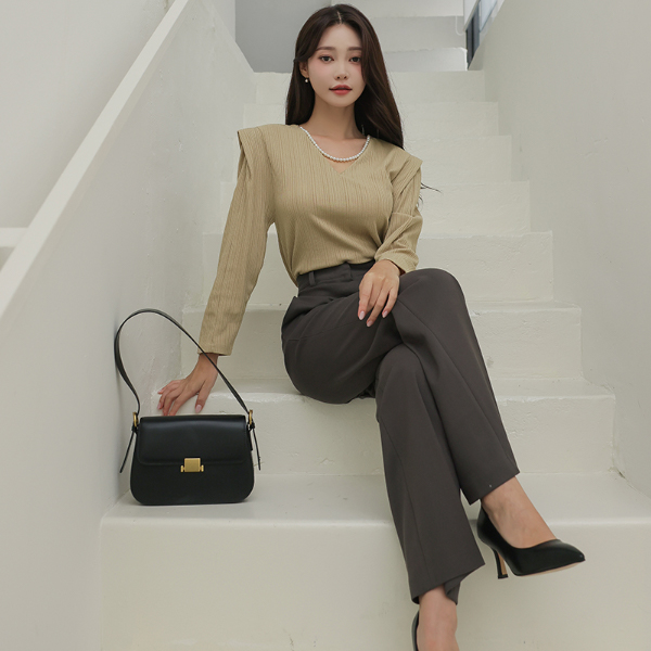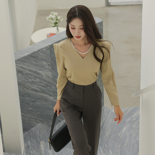 Coco Pearl Necklace Puff V-neck T-shirt (Long-sleeve)