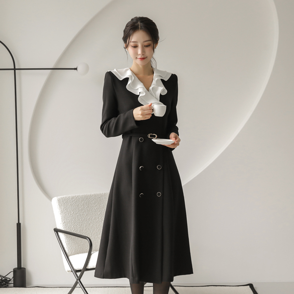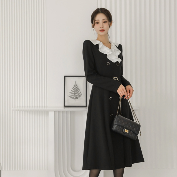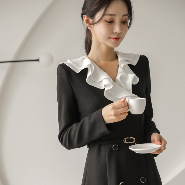 Color Combination Ruffle Collar Double-button Belted Dress