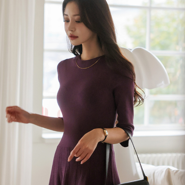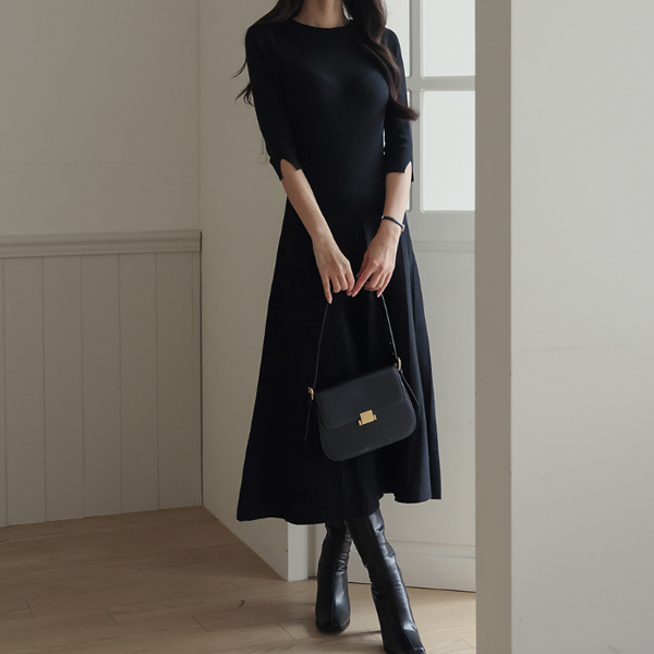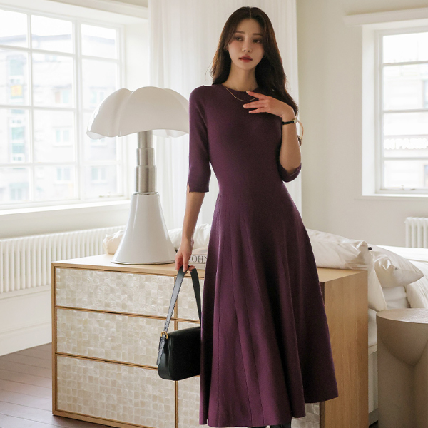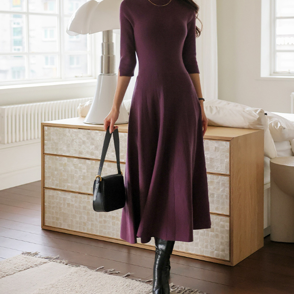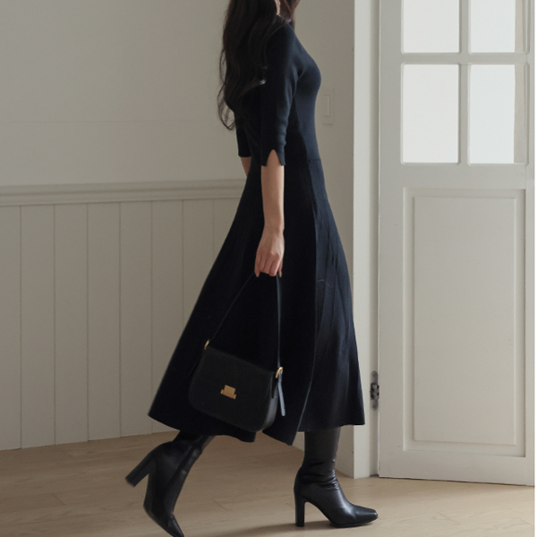 Daily Three-Quarter Sleeves Center Front Vent Flared Long Knit Dress