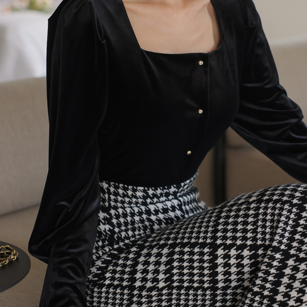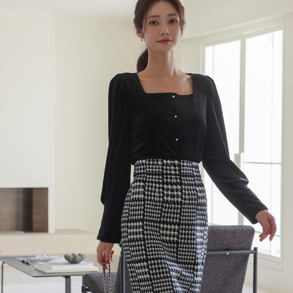 Velvet Square Neck Gold Ball Button Blouse