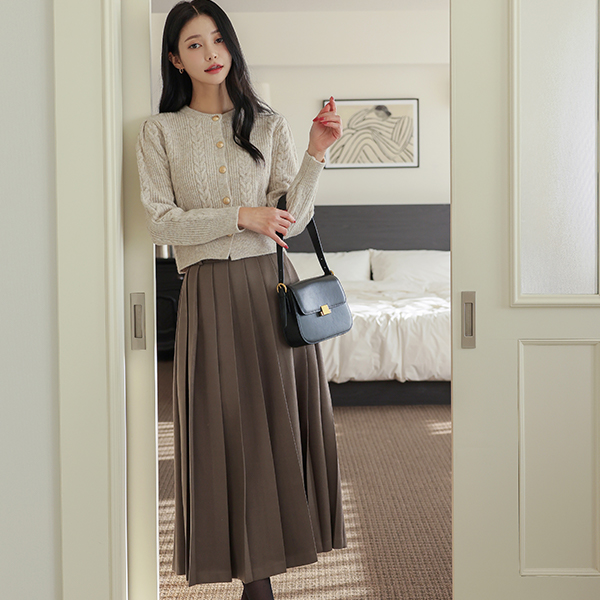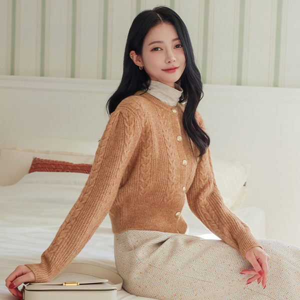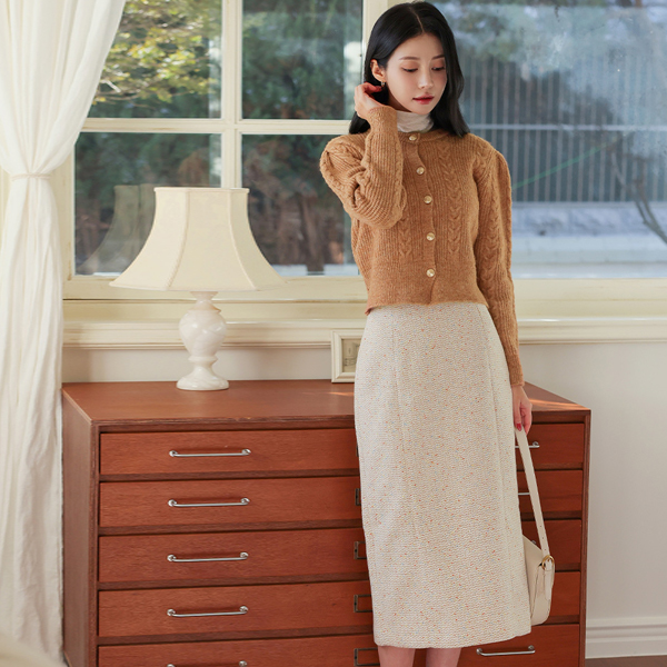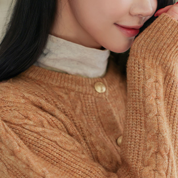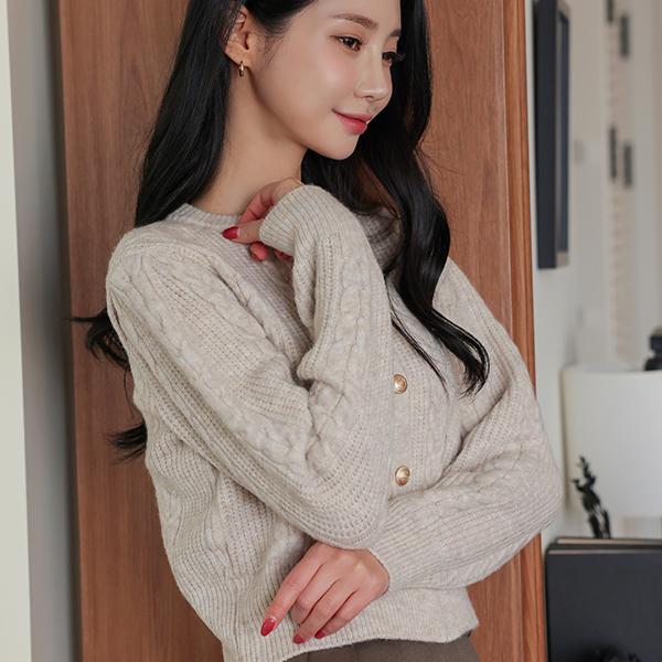 Cable Gold Button Puff Sleeves Wool Cardigan