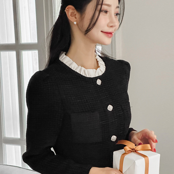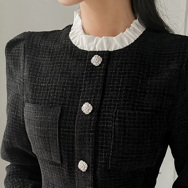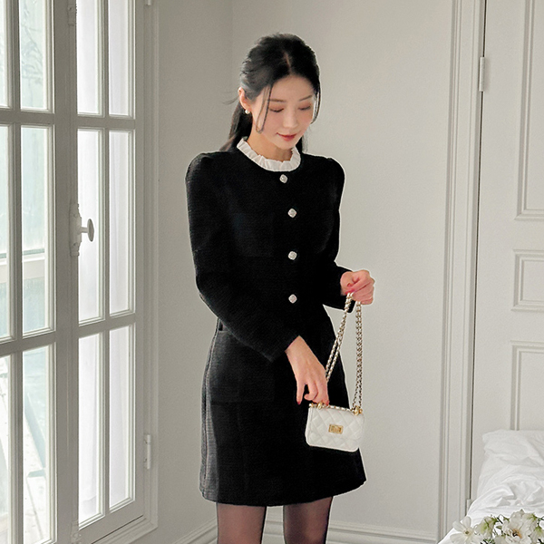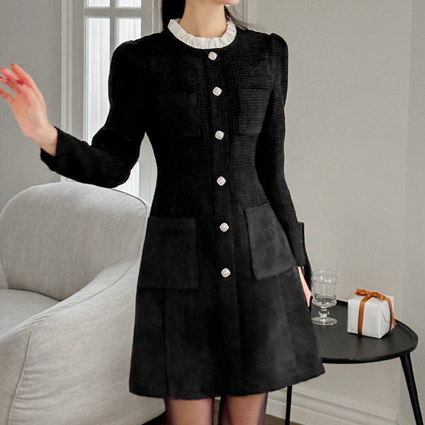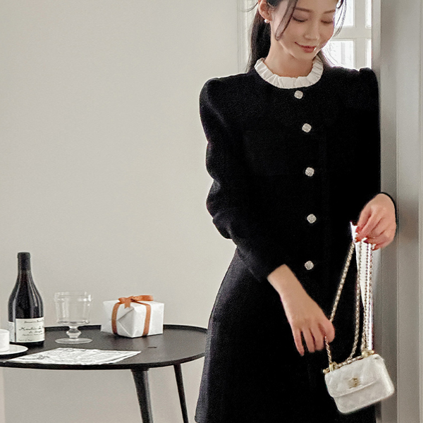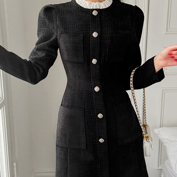 fluffy Wool Tweed Color Combination Frill Neck Puff Dress