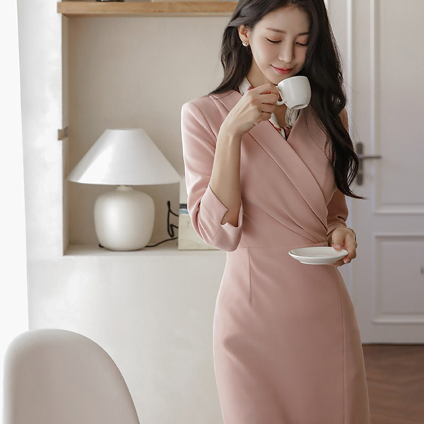 폴딩넥 Wrap Side Shirring Three-Quarter Sleeves Slit Span Dress