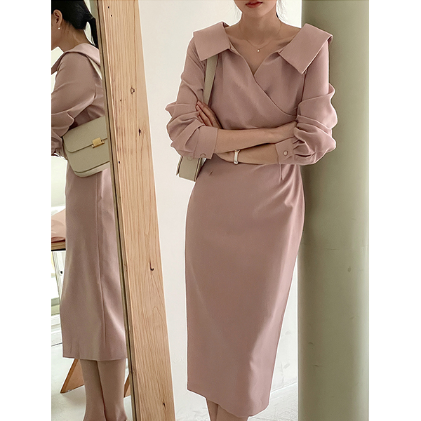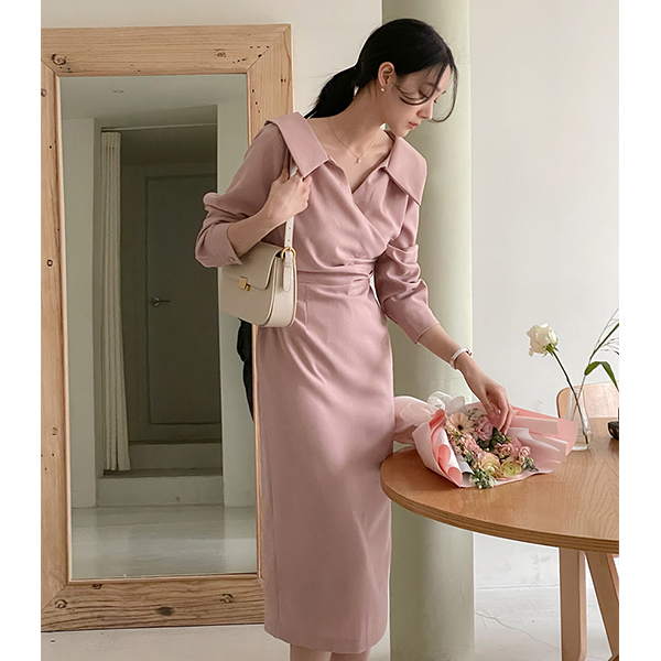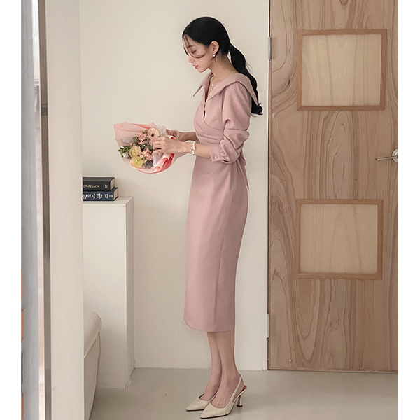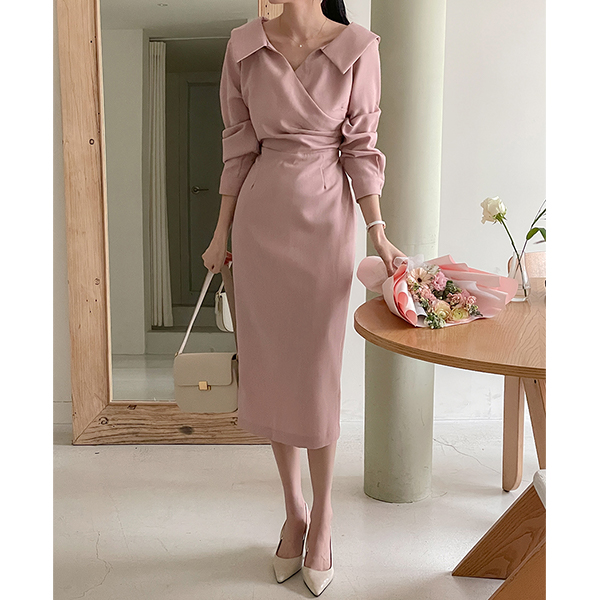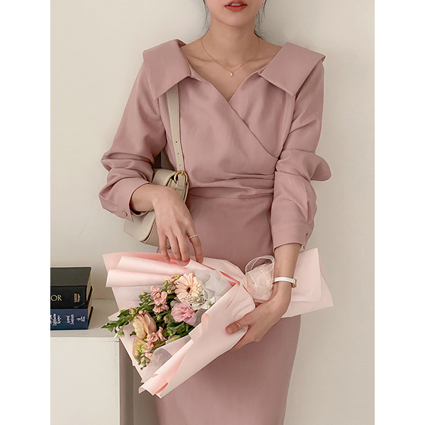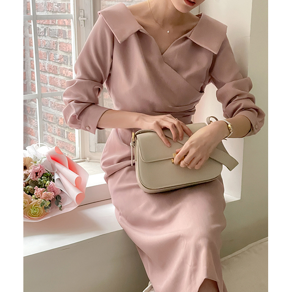 Romantic Open Collar Wrap Shirring Bag Ribbon Point Dress