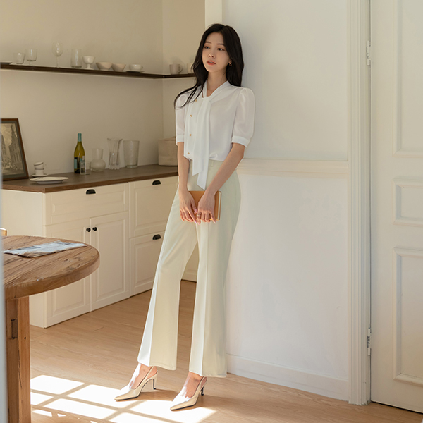 Puff Sleeves Unbalance Neckline Tie Blouse