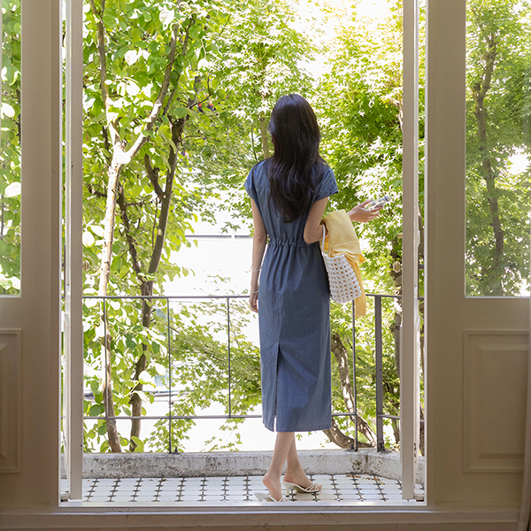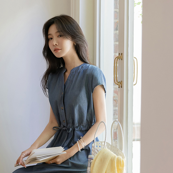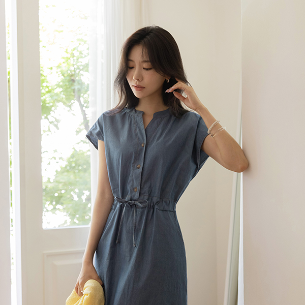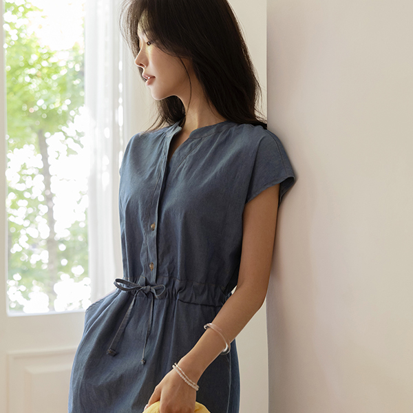 Chinese Collar Cap-Sleeves Denim Dress