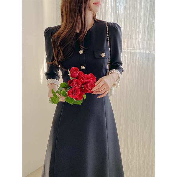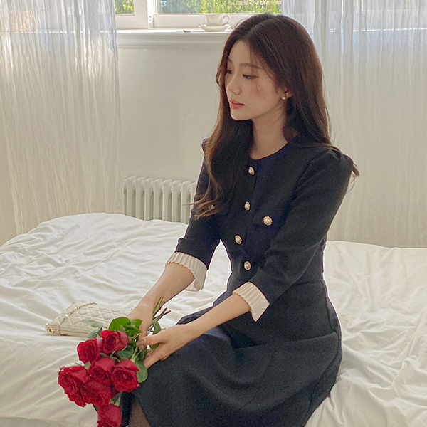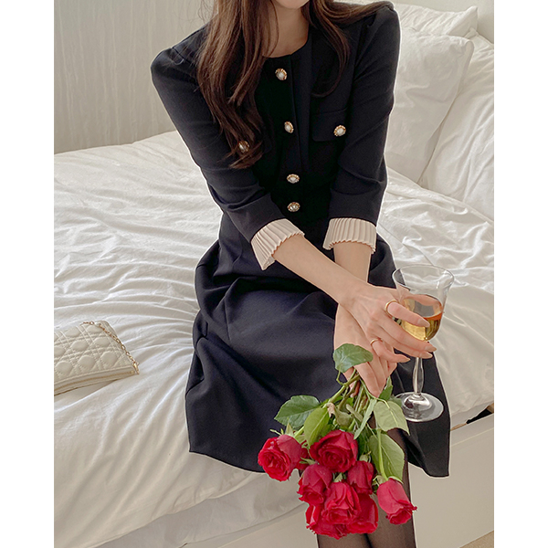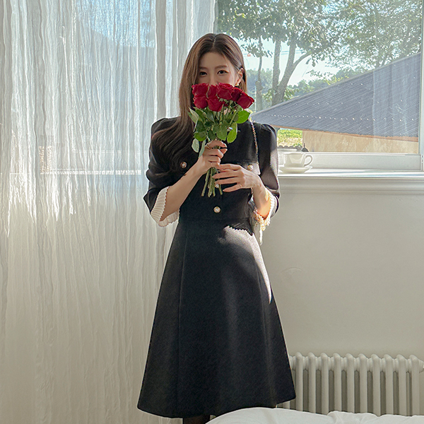 ODE Pleats Sleeves A-line Tweed Dress