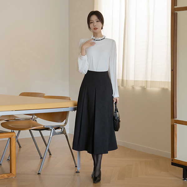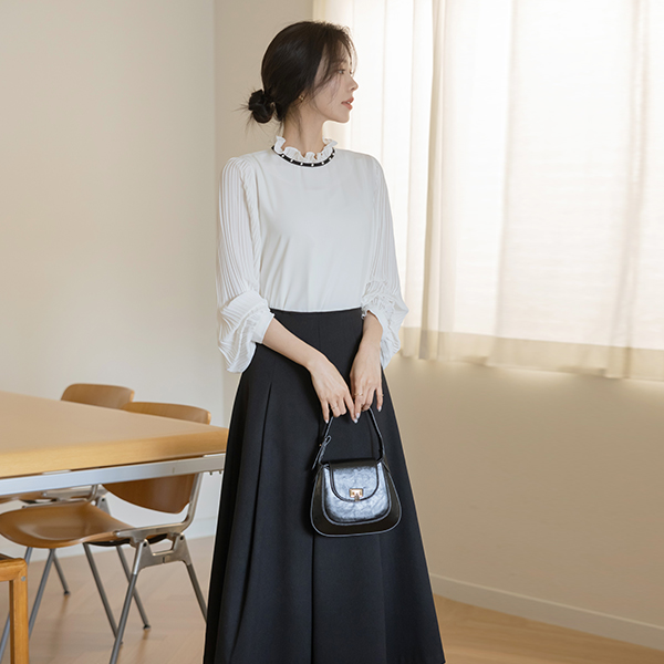 Sleeves Wrinkles Pearl Frill Neck Blouse