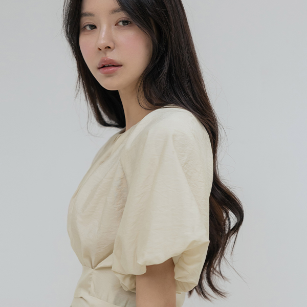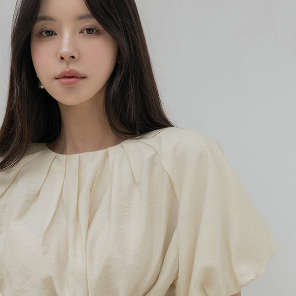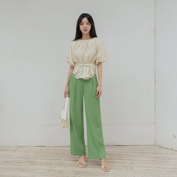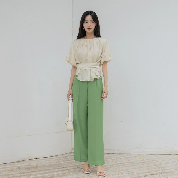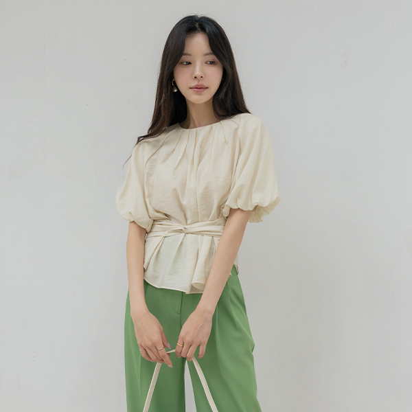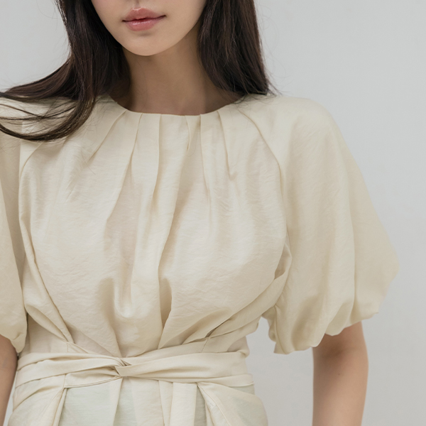 Natural Pintuck Neck Strap Belt Balloon Blouse