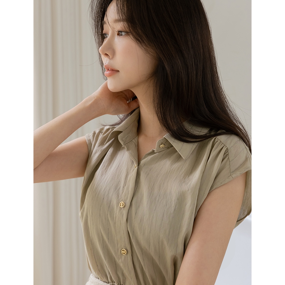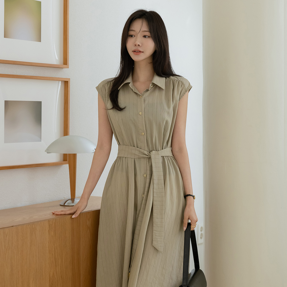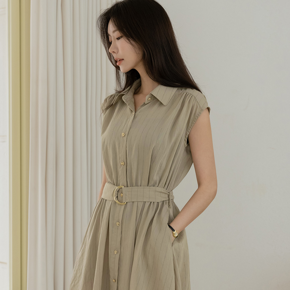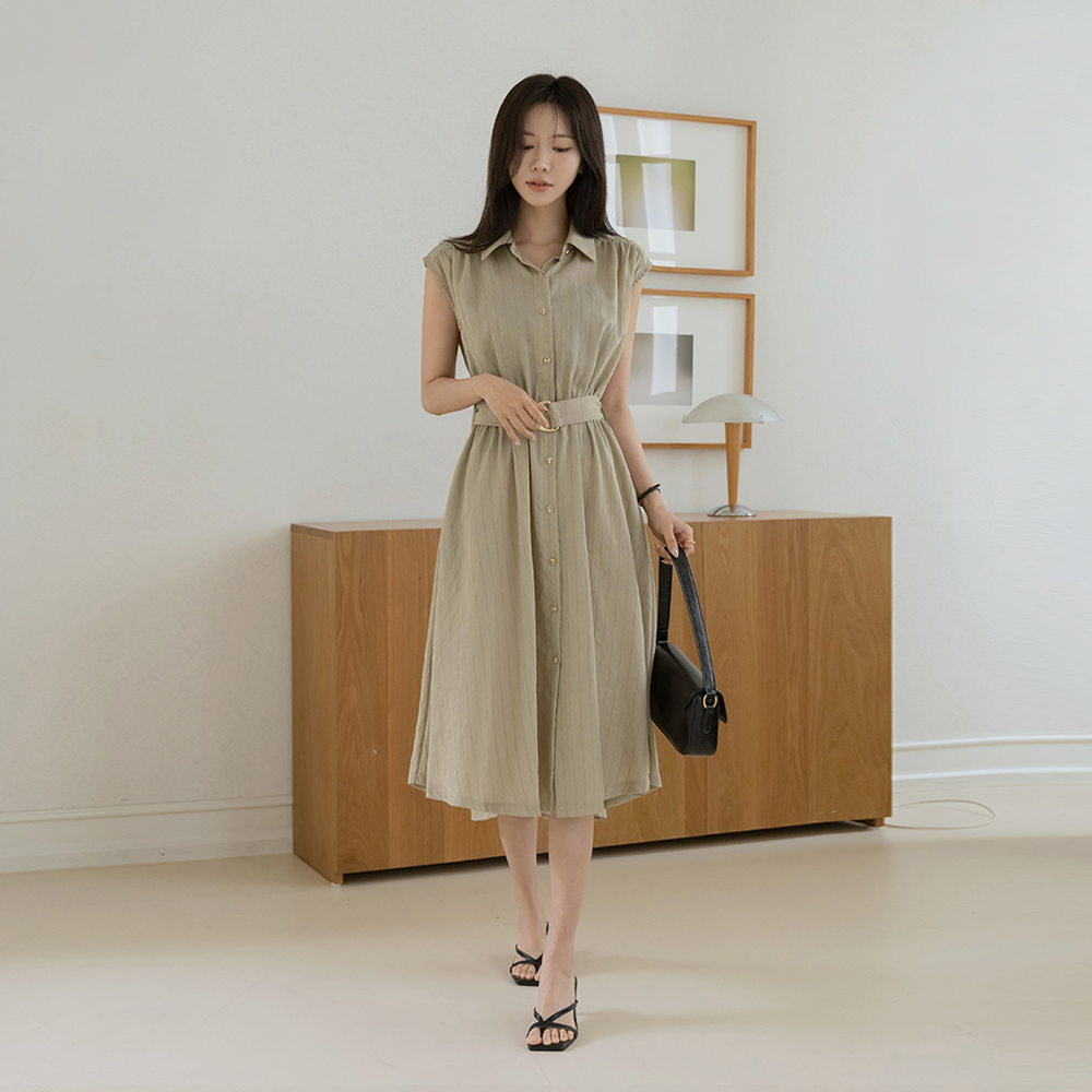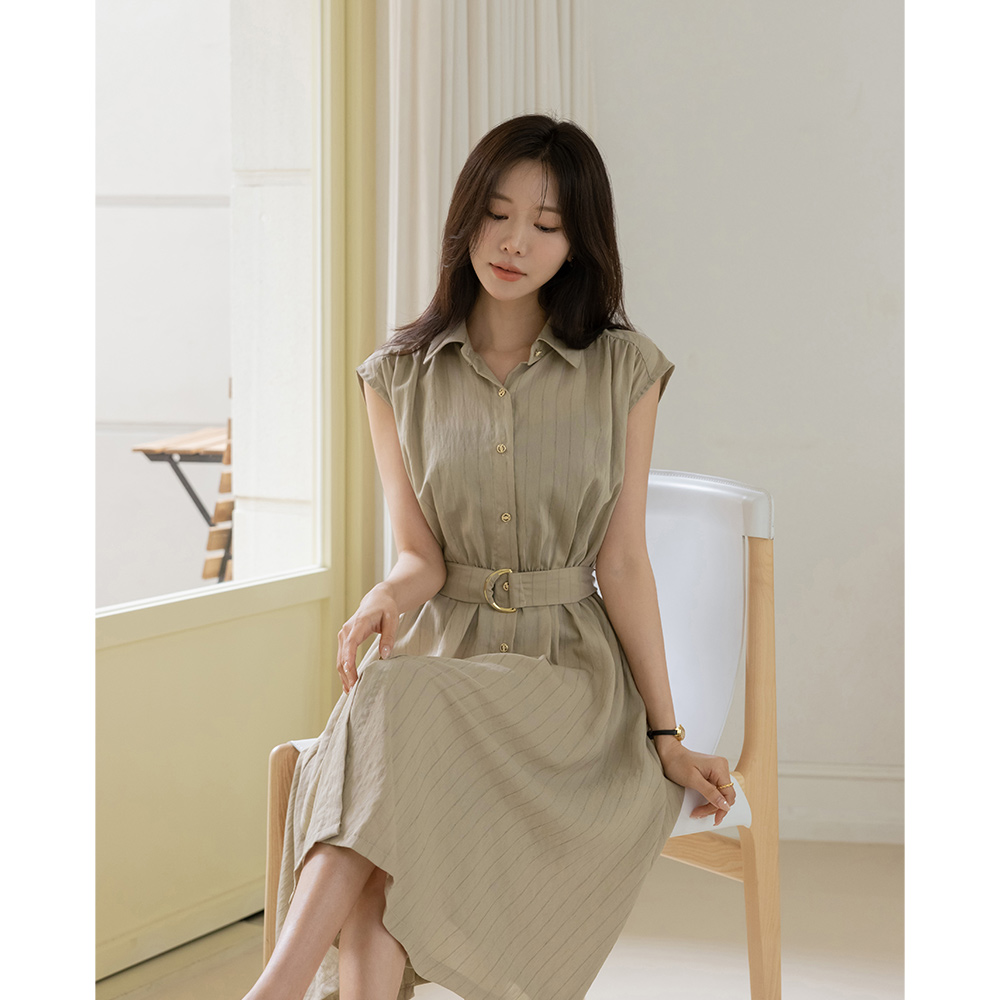 Stripe Linen Collar Sleeveless shirts Dress(+Belt)
