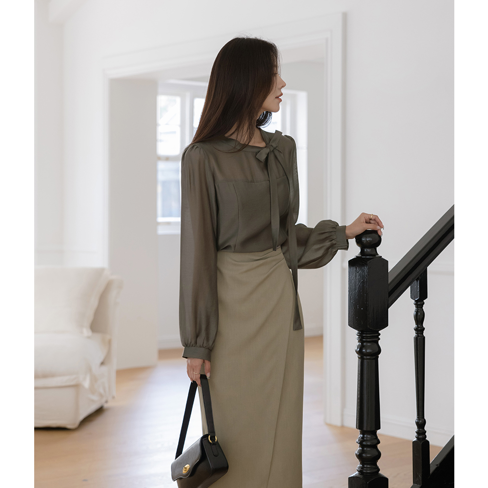 Romantic Ribbon neckline See-through Long-sleeve Blouse