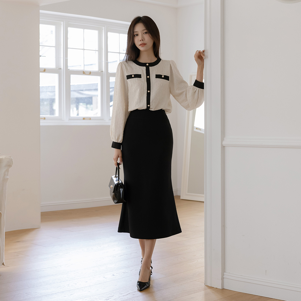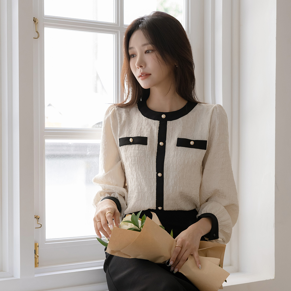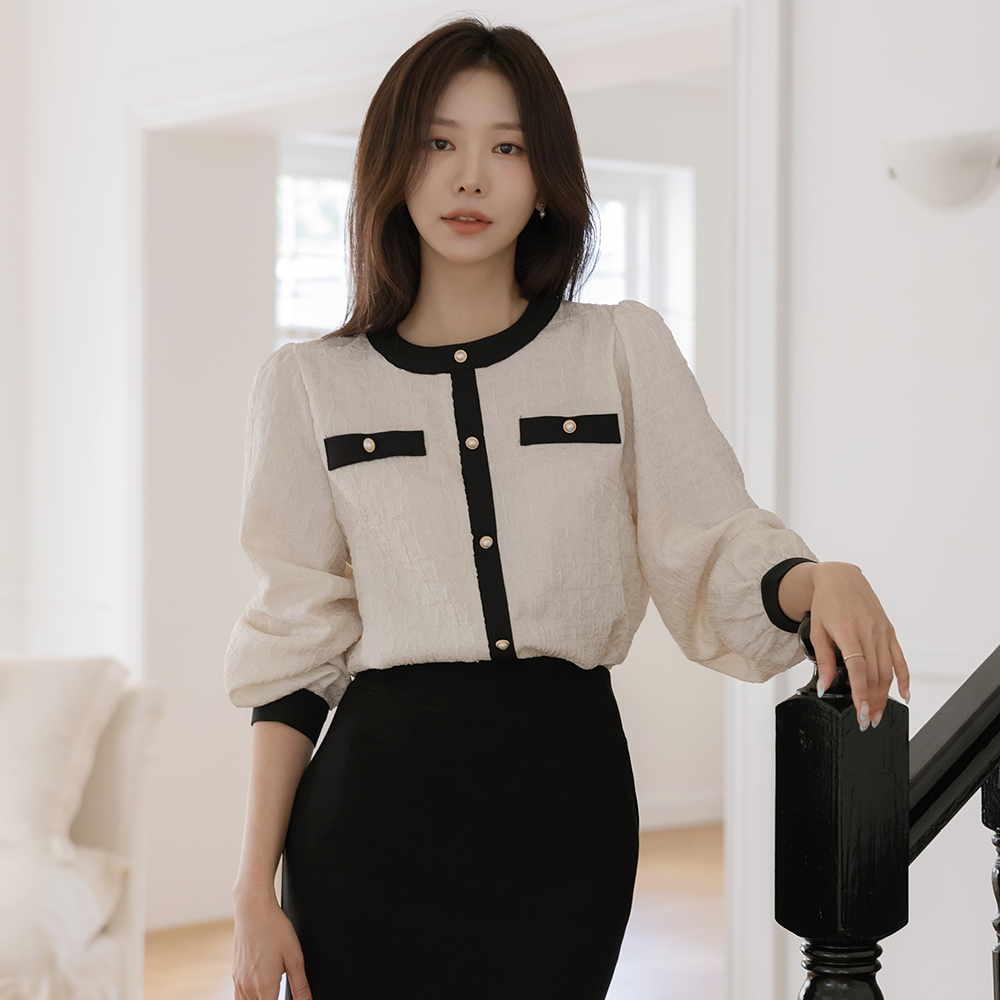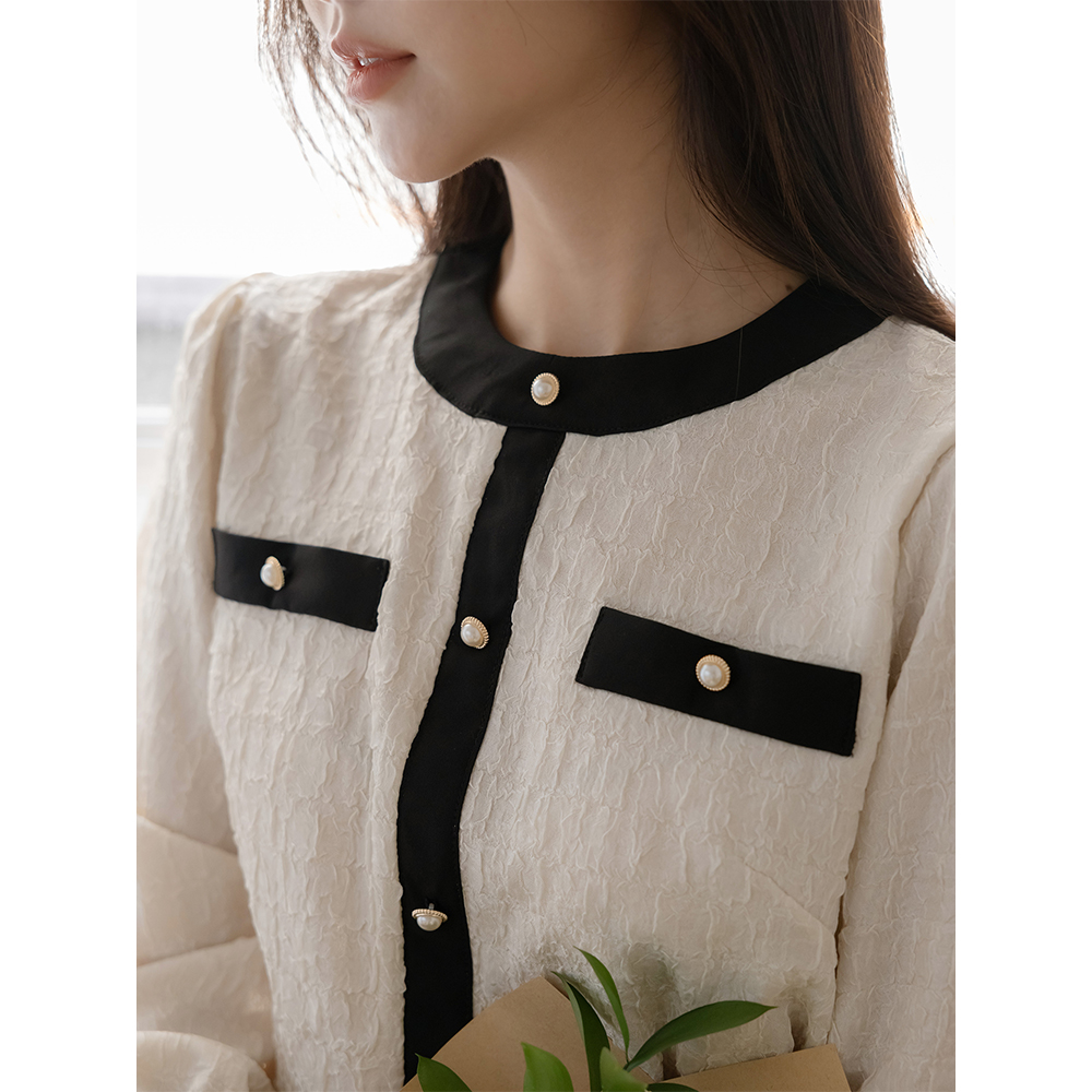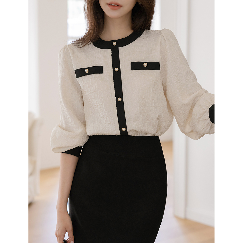 Feminine Color Combination Wrinkle Pearl Blouse