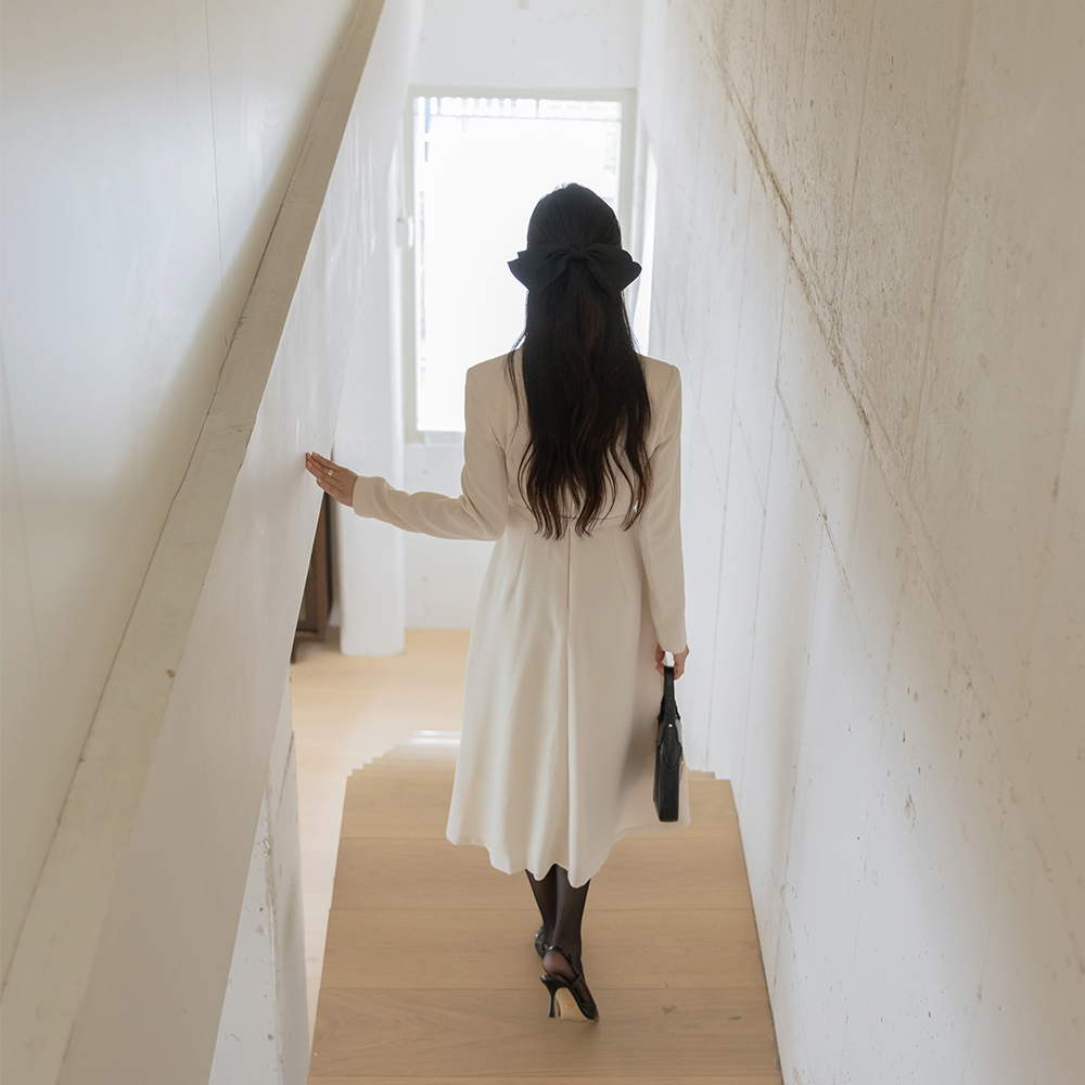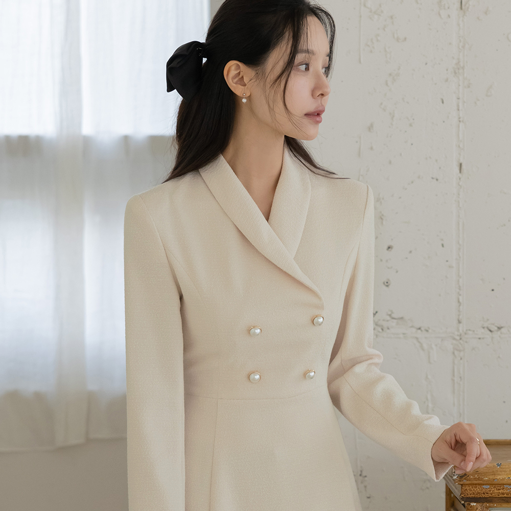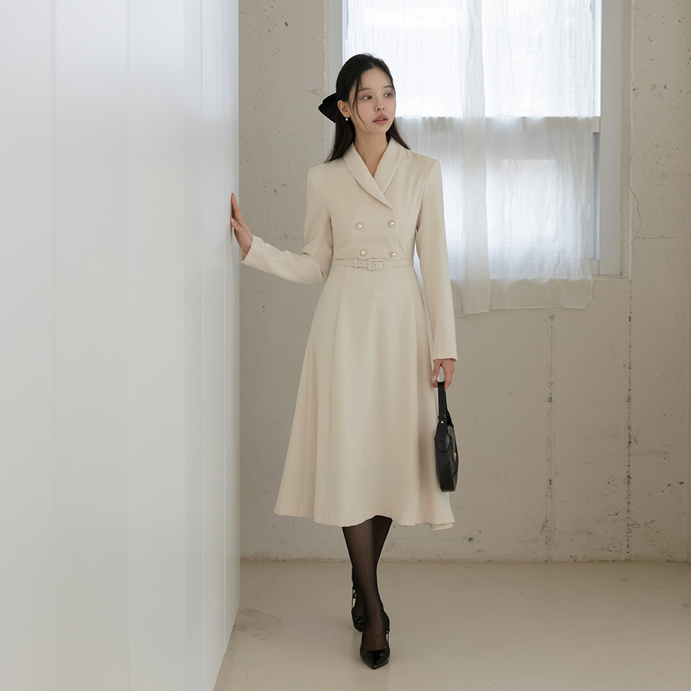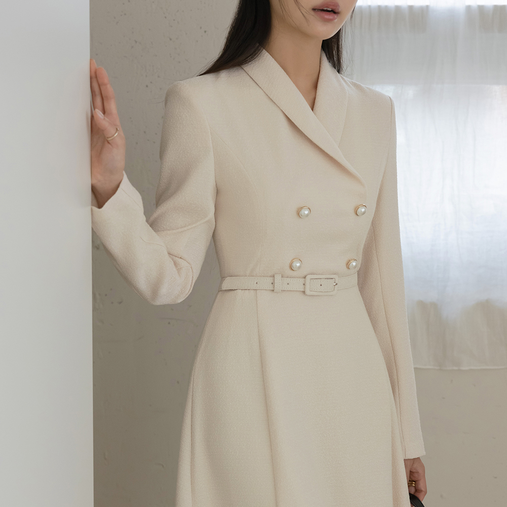 Shawl Collar Pearl Buttons A-line Tweed Dress(+Belt)