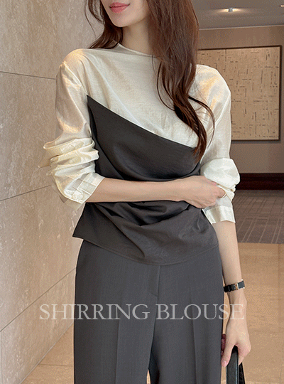 Color Combination Unbalance Shirring Blouse