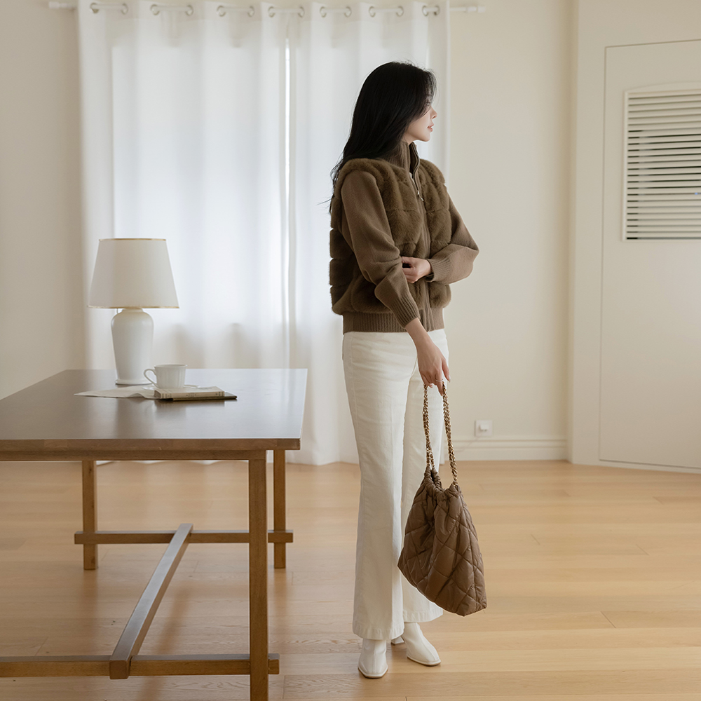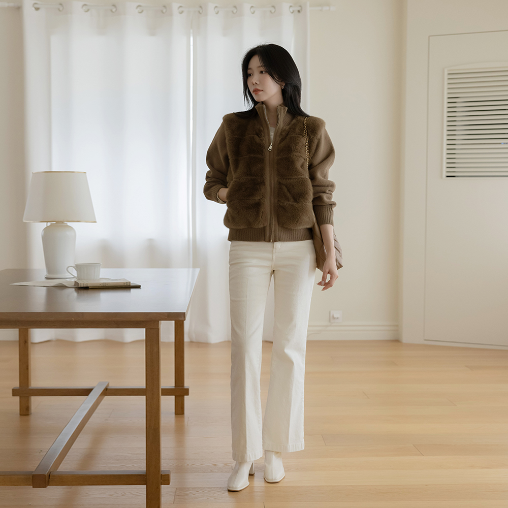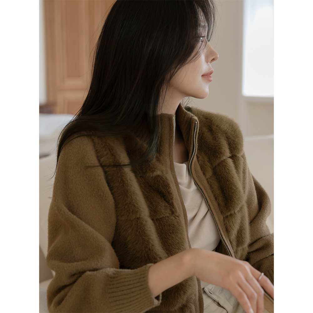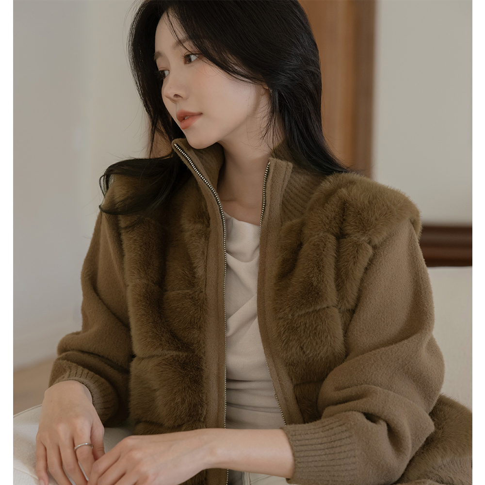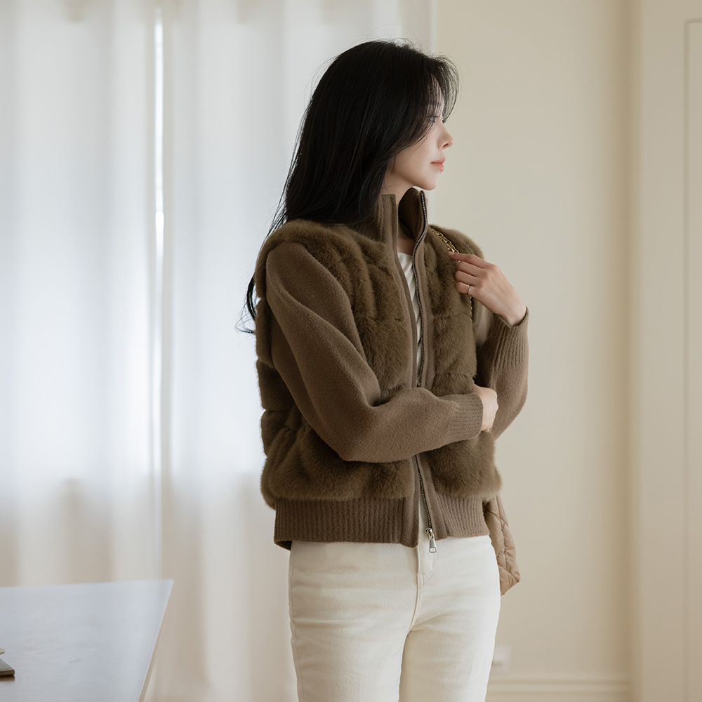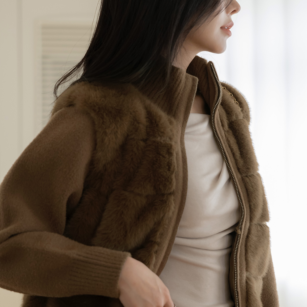 High-Neck Fake Fur Color Combination Zip up Cardigan