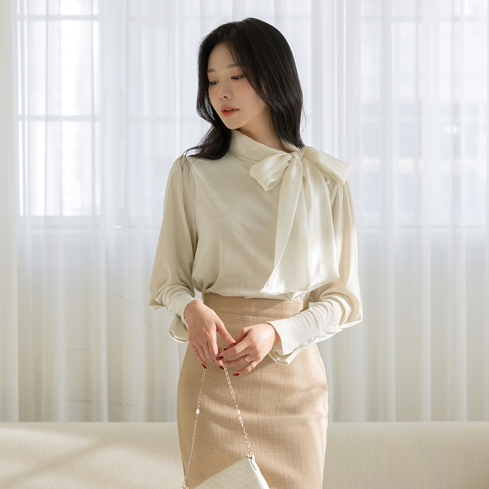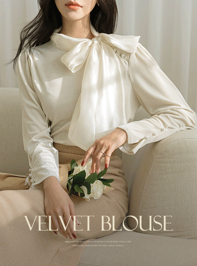 Scarf-Neck Velvet Pearl Blouse