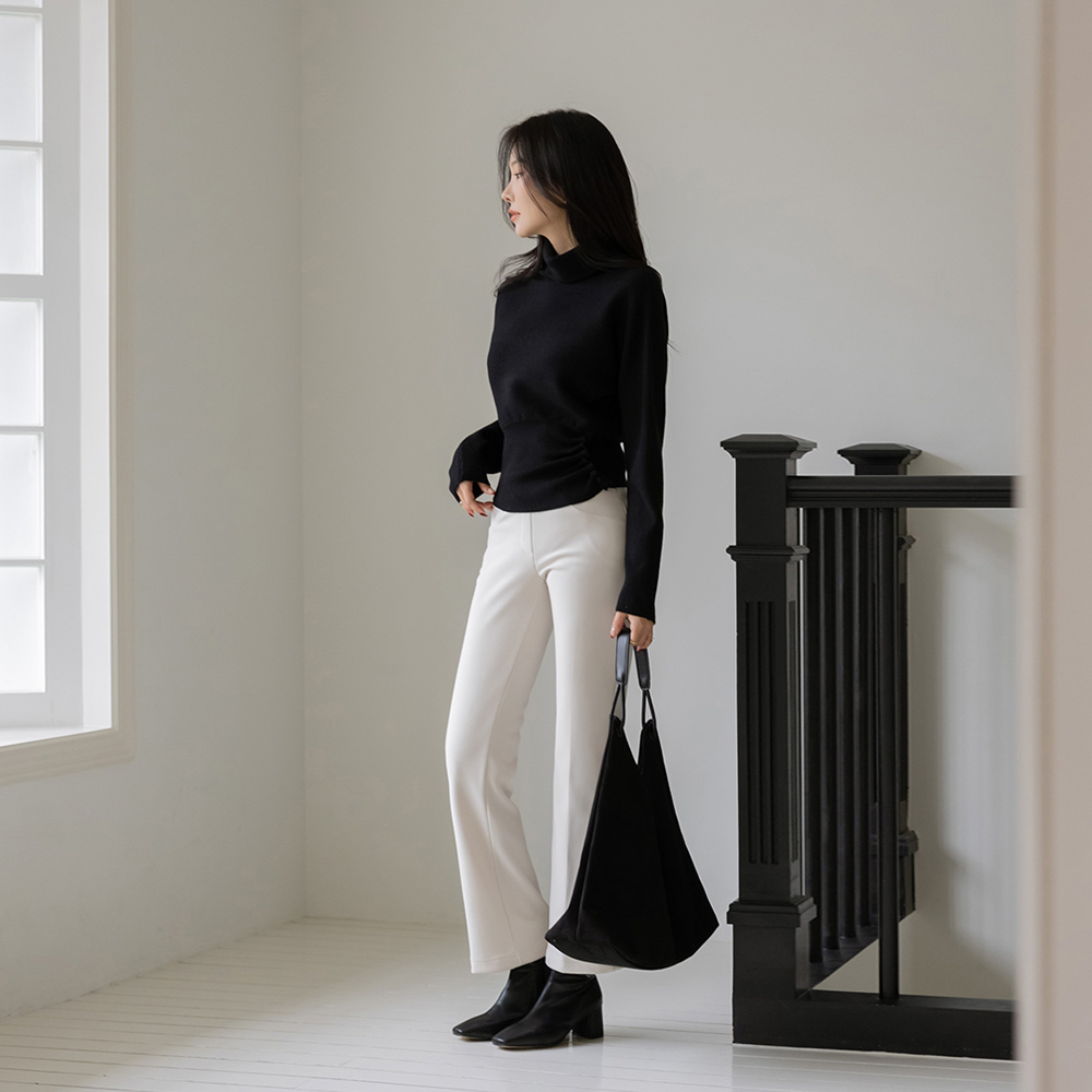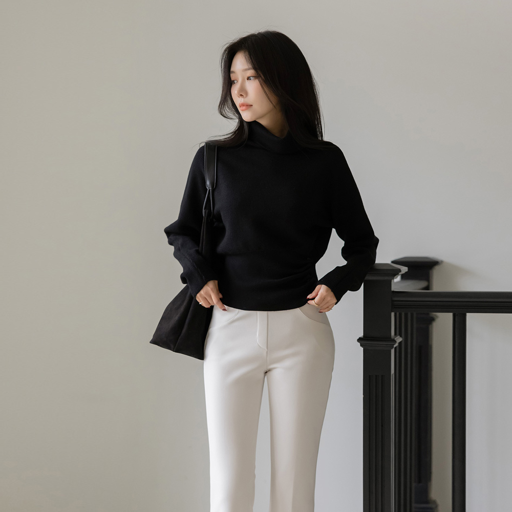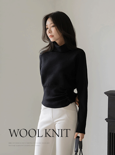 High-Neck Shirring Button Batwing Sleeve Wool Knit
