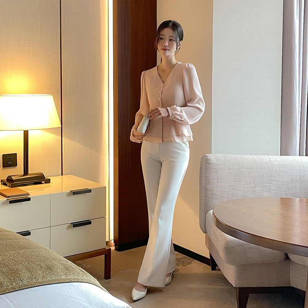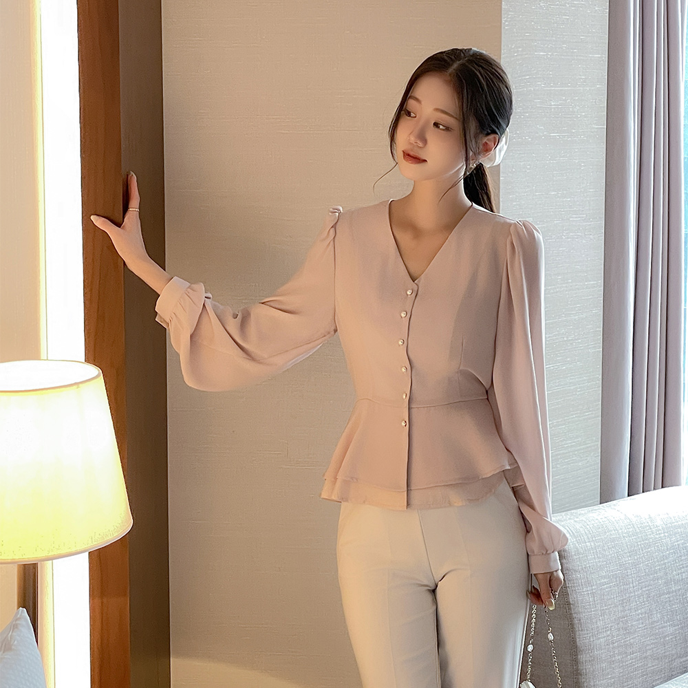 Soft V-neck Double Peplum Back Ribbon Blouse