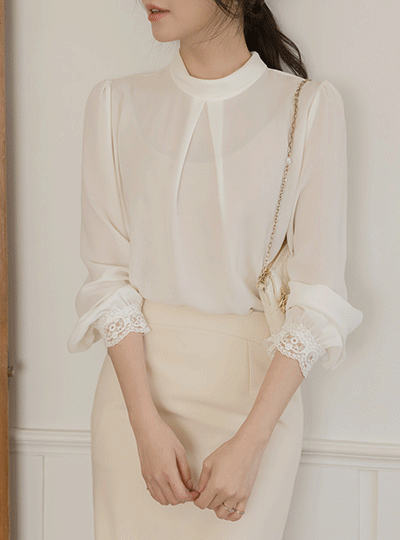 Half-Highneck Pintuck Sleeves Lace Blouse